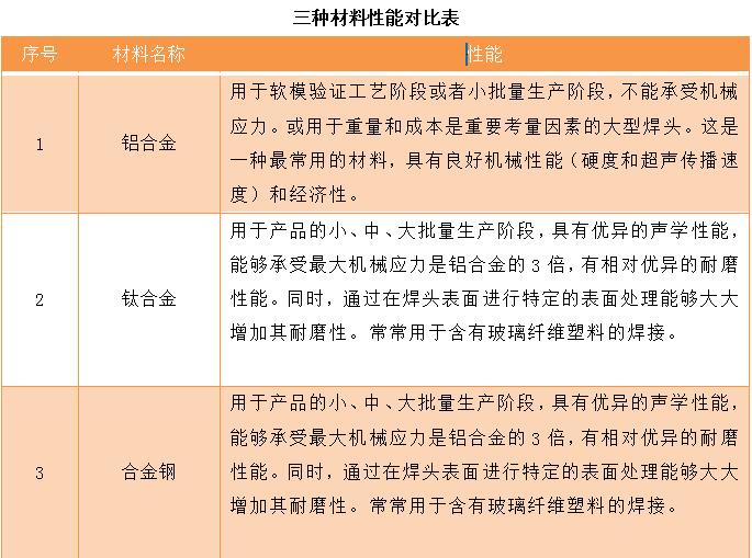 大多數情況下,主要應用鋁合金、鈦合金以及合金鋼三種材料制造焊頭,因為這三種材料的性能各不相同,因此,在實際選材的過程中,要根據使用要求以及其他相關的因素綜合考量之后進行選擇。三種材料性能對比如表所示: