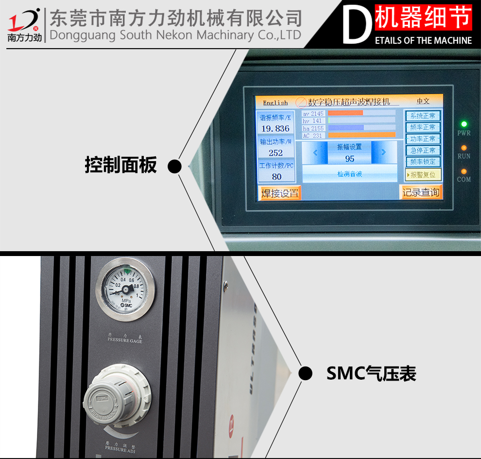 1.本機采用NTK換能器,FESTO氣缸,SMC調壓閥;