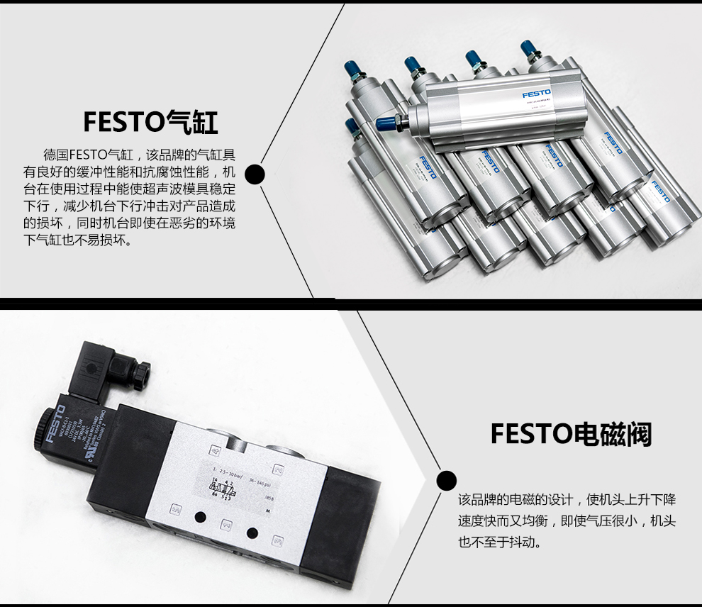 5、德國FESTO氣缸,該品牌的氣缸具有良好的緩沖性能和抗腐蝕性能,機臺在使用過程中能使超聲波模具穩定下行,減少機臺下行沖擊對產品造成的損壞,同時機臺即使在惡劣的環境下氣缸也不易損壞。